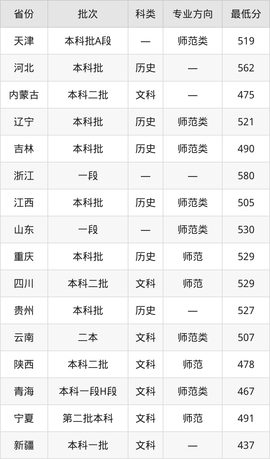 新疆师范大学历史学专业录取分数线从437分到580分不等,在部分地区的最低分数线如下: