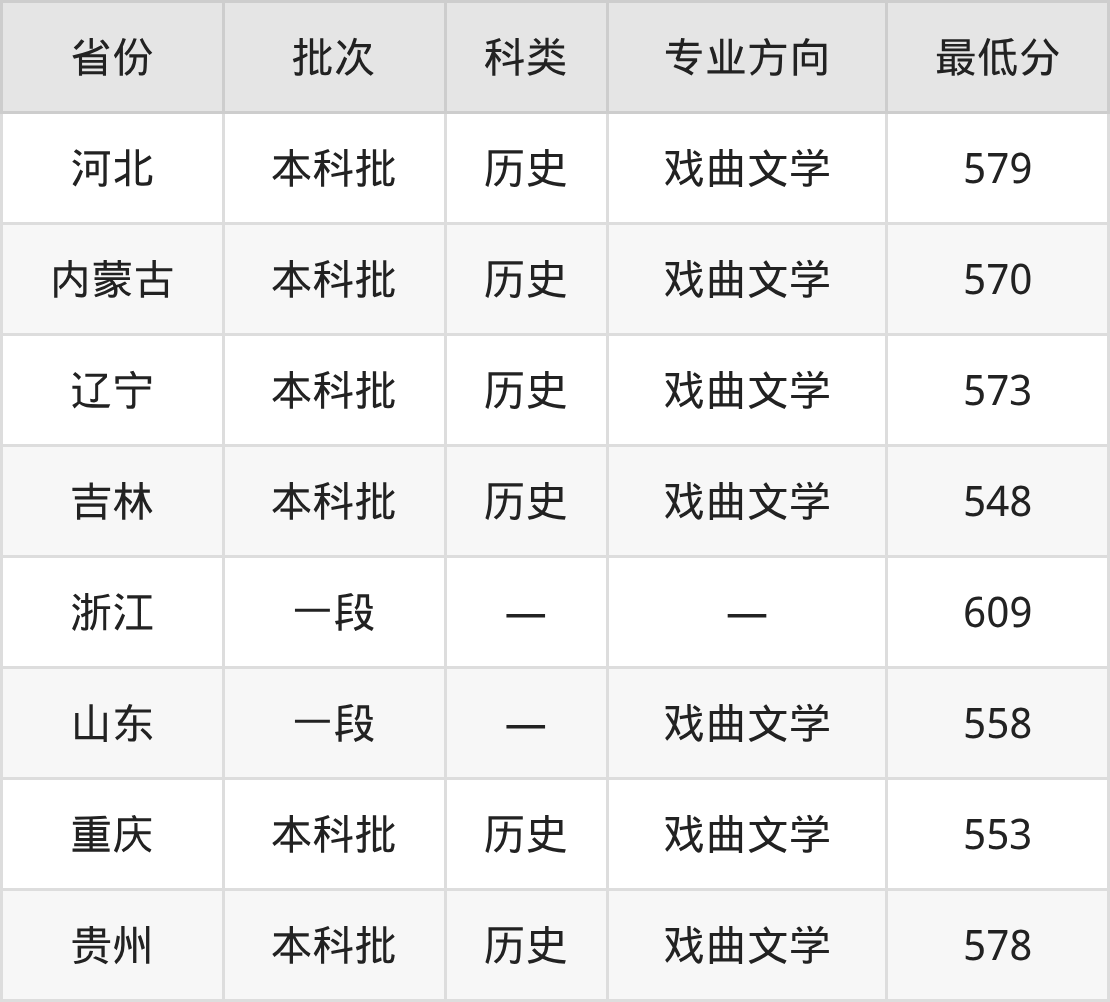 中国戏曲学院戏剧影视文学专业在全国各省最低录取分数线为548分(吉林历史类),除此之外,在其余地区的最低分为河北历史类579分、内蒙古历史类570分、辽宁历史类573分、浙江609分等,以上数据均为2025年数据,供2026年高考生参考。
