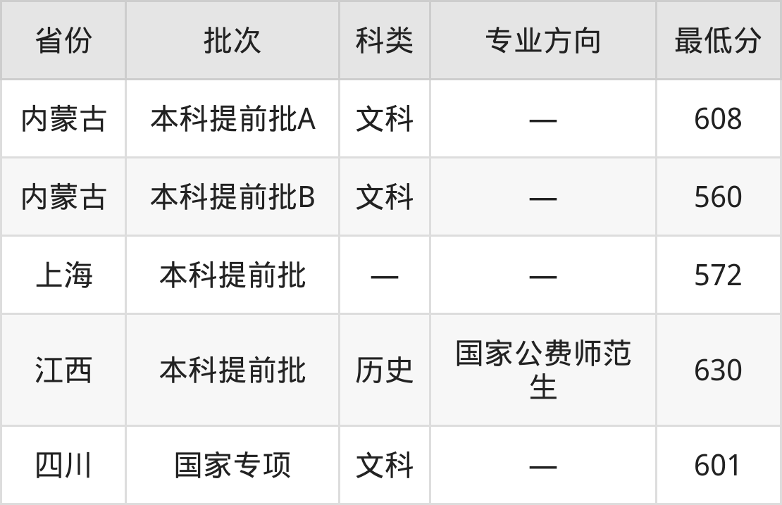华东师范大学思想政治教育专业在全国各省最低录取分数线为560分(内蒙古文科),除此之外,在其余地区的最低分为上海572分、江西历史类630分、四川文科601分,以上数据均为2024年数据,供2025年高考生参考。