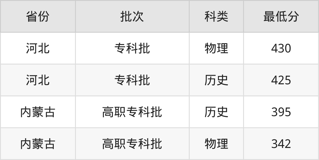 山西管理职业学院计算机应用技术专业录取分数线从342分到430分不等,最低分数线如下:
