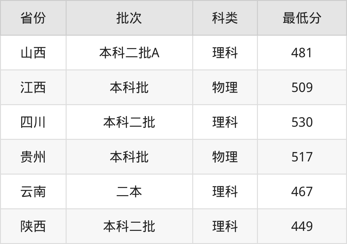 西南林业大学电子商务专业在全国各省最低录取分数线为449分(陕西理科),除此之外,在其余地区的最低分为山西理科481分、江西物理类509分、四川理科530分、贵州物理类517分等,以上数据均为2024年数据,供2025年高考生参考。