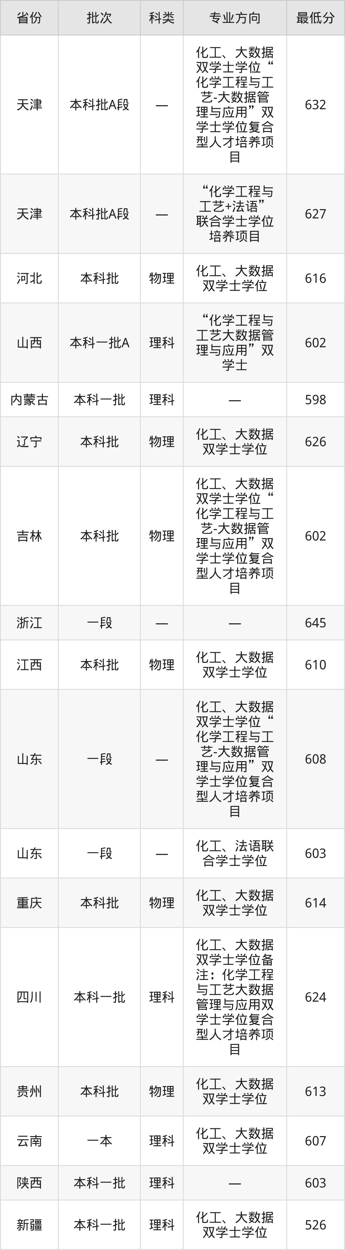 北京化工大学化学工程与工艺专业在全国各省录取分数线: