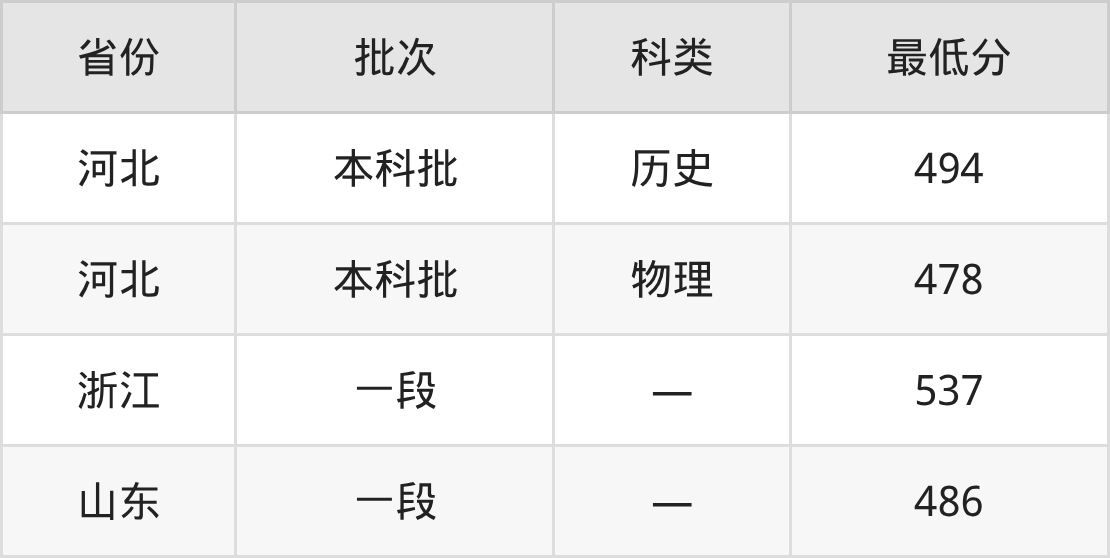 北海艺术设计学院汉语言文学专业在全国各省最低录取分数线为478分(河北物理类),除此之外,在其余地区的最低分为浙江537分、山东486分,以上数据均为2025年数据,供2026年高考生参考。
