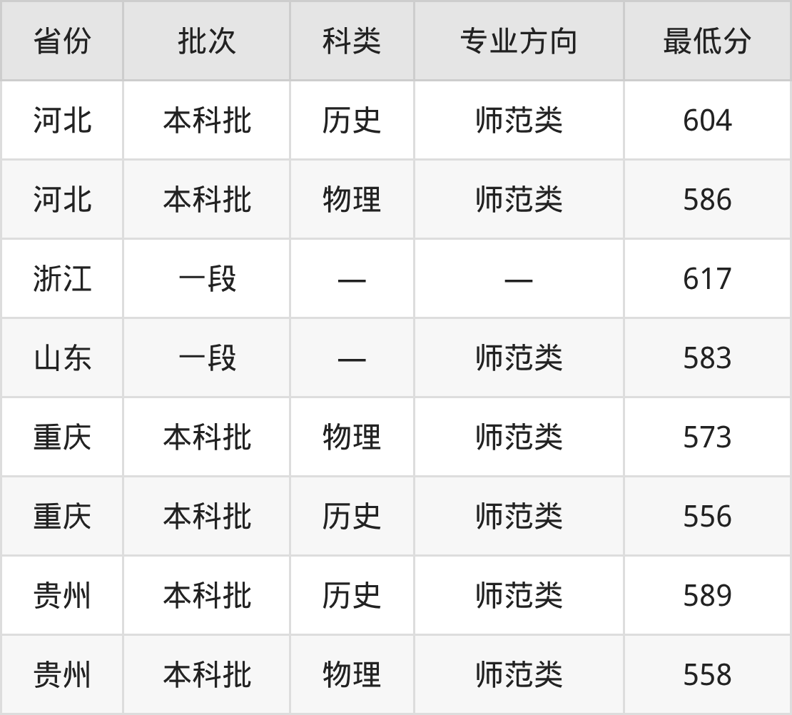 重庆师范大学思想政治教育专业在全国各省最低录取分数线为556分(重庆历史类),除此之外,在其余地区的最低分为河北物理类586分、浙江617分、山东583分、贵州物理类558分,以上数据均为2025年数据,供2026年高考生参考。