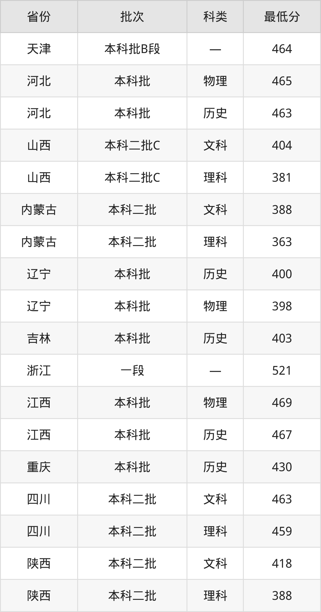 辽宁对外经贸学院英语专业录取分数线从363分到521分不等,在部分地区的最低分数线如下: