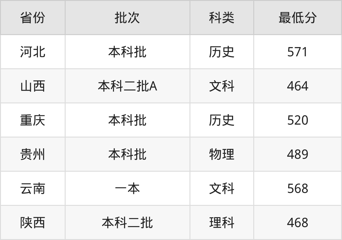广西师范大学金融学专业在全国各省最低录取分数线为464分(山西文科),除此之外,在其余地区的最低分为陕西理科468分、河北历史类571分、重庆历史类520分、贵州物理类489分等,以上数据均为2024年数据,供2025年高考生参考。