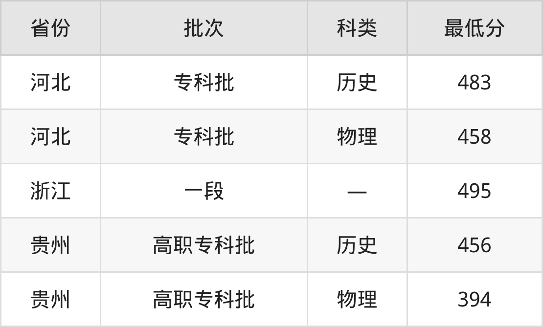 洛阳职业技术学院中医学专业在全国各省最低录取分数线为394分(贵州物理类),除此之外,在其余地区的最低分为浙江495分、河北物理类458分,以上数据均为2025年数据,供2026年高考生参考。