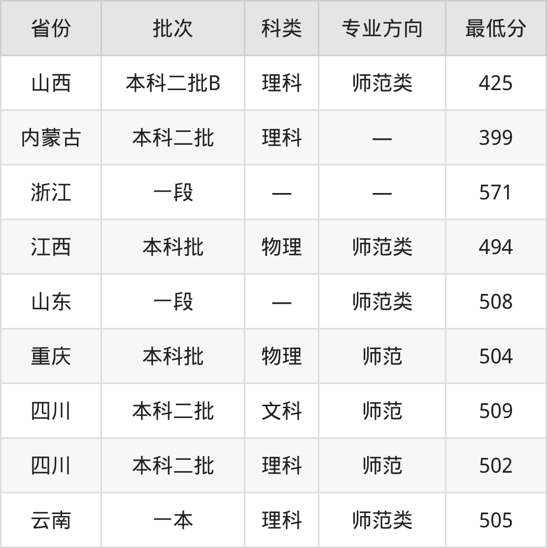楚雄师范学院地理科学专业在全国各省最低录取分数线为399分(内蒙古理科),除此之外,在其余地区的最低分为重庆物理类504分、四川理科502分、云南理科505分、山西理科425分等,以上数据均为2024年数据,供2025年高考生参考。