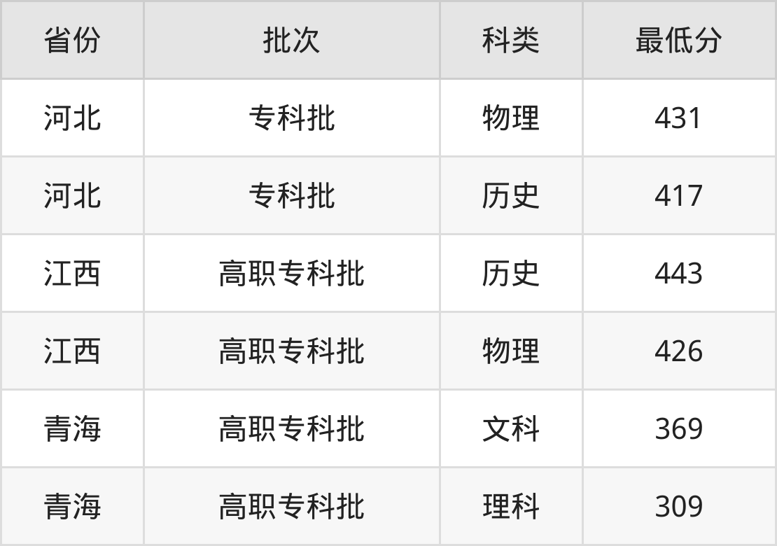 柳州铁道职业技术学院铁道养路机械应用技术专业在全国各省最低录取分数线为309分(青海理科),除此之外,在其余地区的最低分为河北历史类417分、江西物理类426分,以上数据均为2024年数据,供2025年高考生参考。