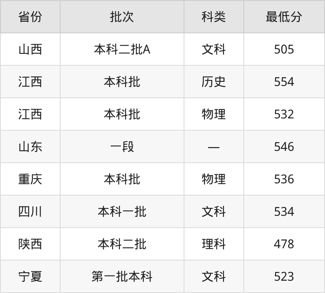 西北师范大学数字媒体艺术专业在全国各省最低录取分数线为478分(陕西理科),除此之外,在其余地区的最低分为重庆物理类536分、四川文科534分、宁夏文科523分、山西文科505分等,以上数据均为2024年数据,供2025年高考生参考。