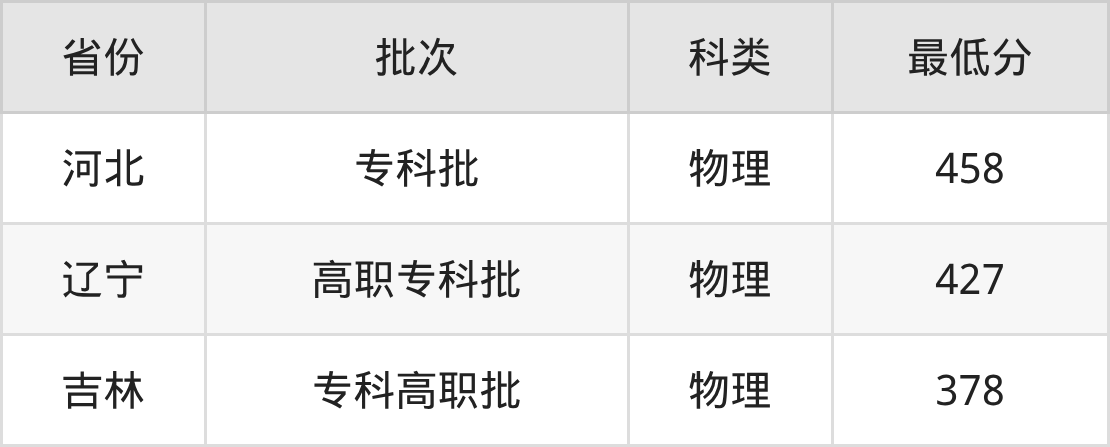 辽宁轨道交通职业学院机电一体化技术专业在全国各省最低录取分数线为378分(吉林物理类),除此之外,在其余地区的最低分为河北物理类458分、辽宁物理类427分,以上数据均为2025年数据,供2026年高考生参考。