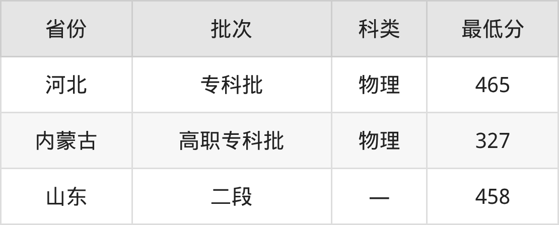 山西工程职业学院机电一体化技术专业录取分数线从327分到465分不等,最低分数线如下: