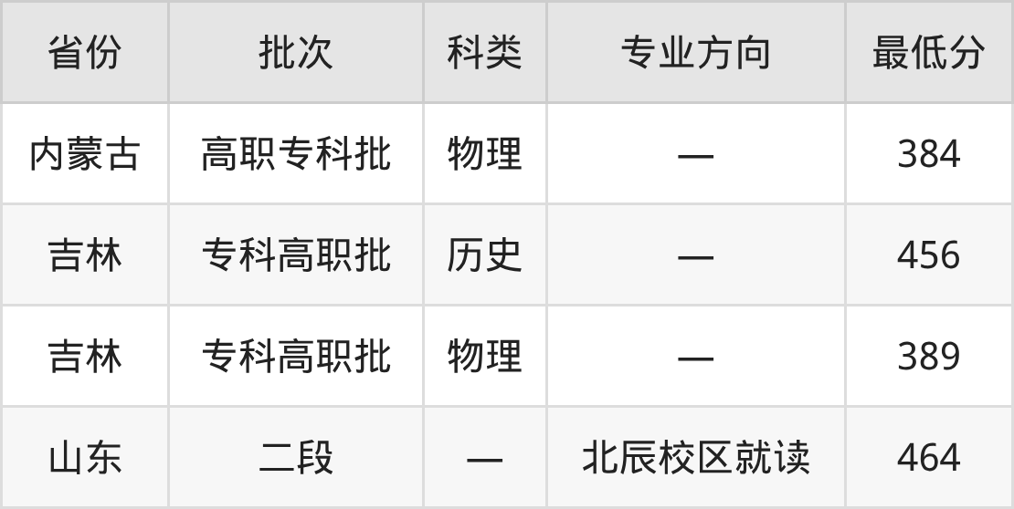天津市职业大学工程造价专业在全国各省最低录取分数线为384分(内蒙古物理类),除此之外,在其余地区的最低分为山东464分、吉林物理类389分,以上数据均为2025年数据,供2026年高考生参考。