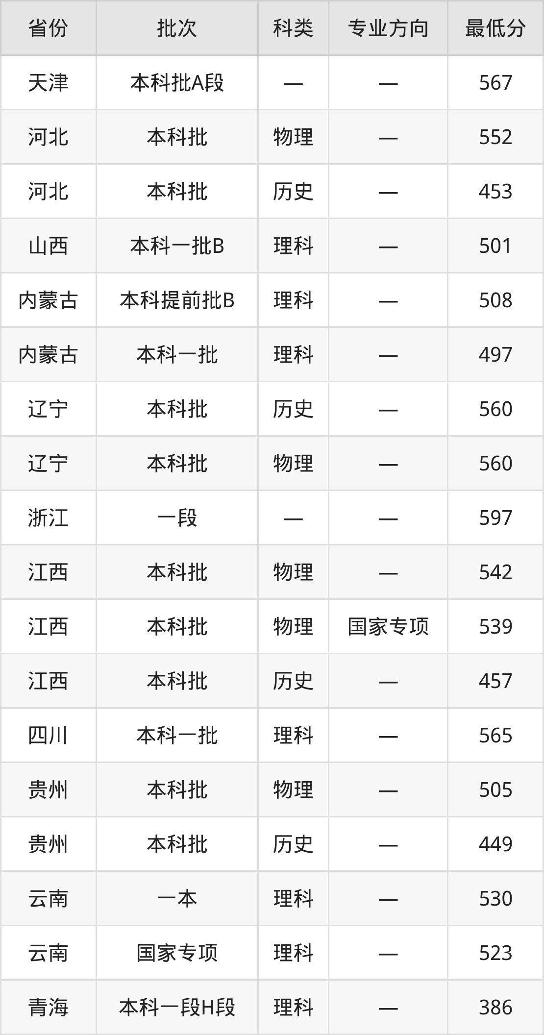 天津中医药大学护理学类专业在全国各省最低录取分数线为386分(青海理科),除此之外,在其余地区的最低分为河北历史类453分、内蒙古理科497分、江西历史类457分、贵州历史类449分等,以上数据均为2024年数据,供2025年高考生参考。
