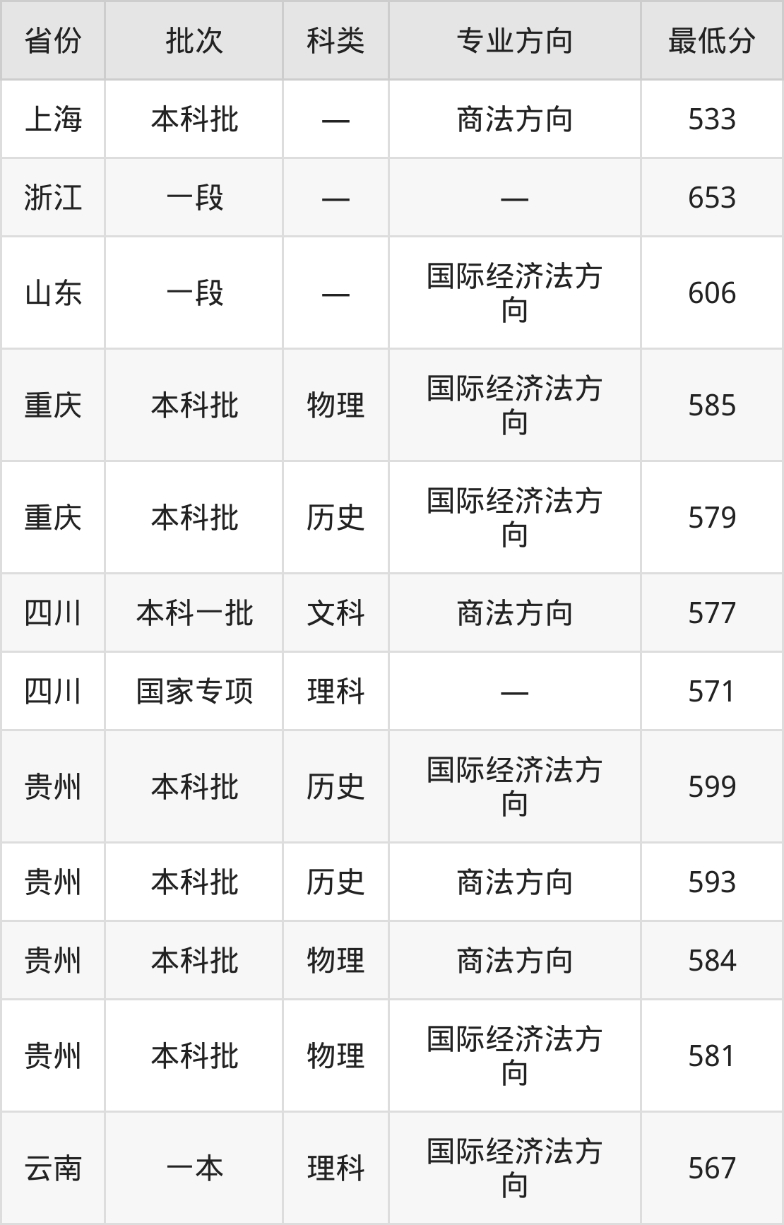 上海对外经贸大学法学专业在全国各省录取分数线: