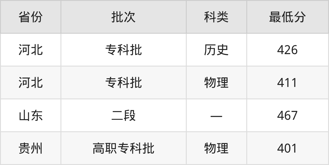新疆司法警官职业学院社区矫正专业在全国各省最低录取分数线为401分(贵州物理类),除此之外,在其余地区的最低分为山东467分、河北物理类411分,以上数据均为2025年数据,供2026年高考生参考。