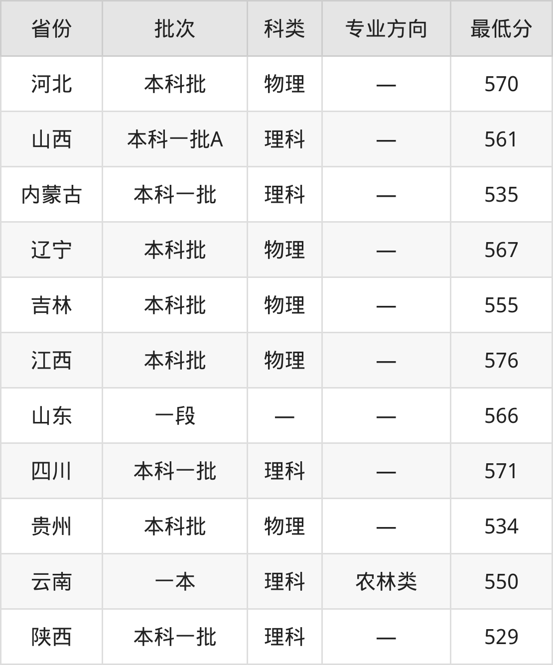东北农业大学植物保护专业录取分数线从529分到576分不等,在部分地区的最低分数线如下: