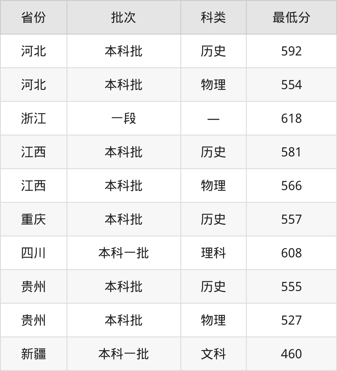 贵州大学日语专业在全国各省最低录取分数线为460分(新疆文科),除此之外,在其余地区的最低分为河北物理类554分、浙江618分、江西物理类566分、重庆历史类557分等,以上数据均为2024年数据,供2025年高考生参考。