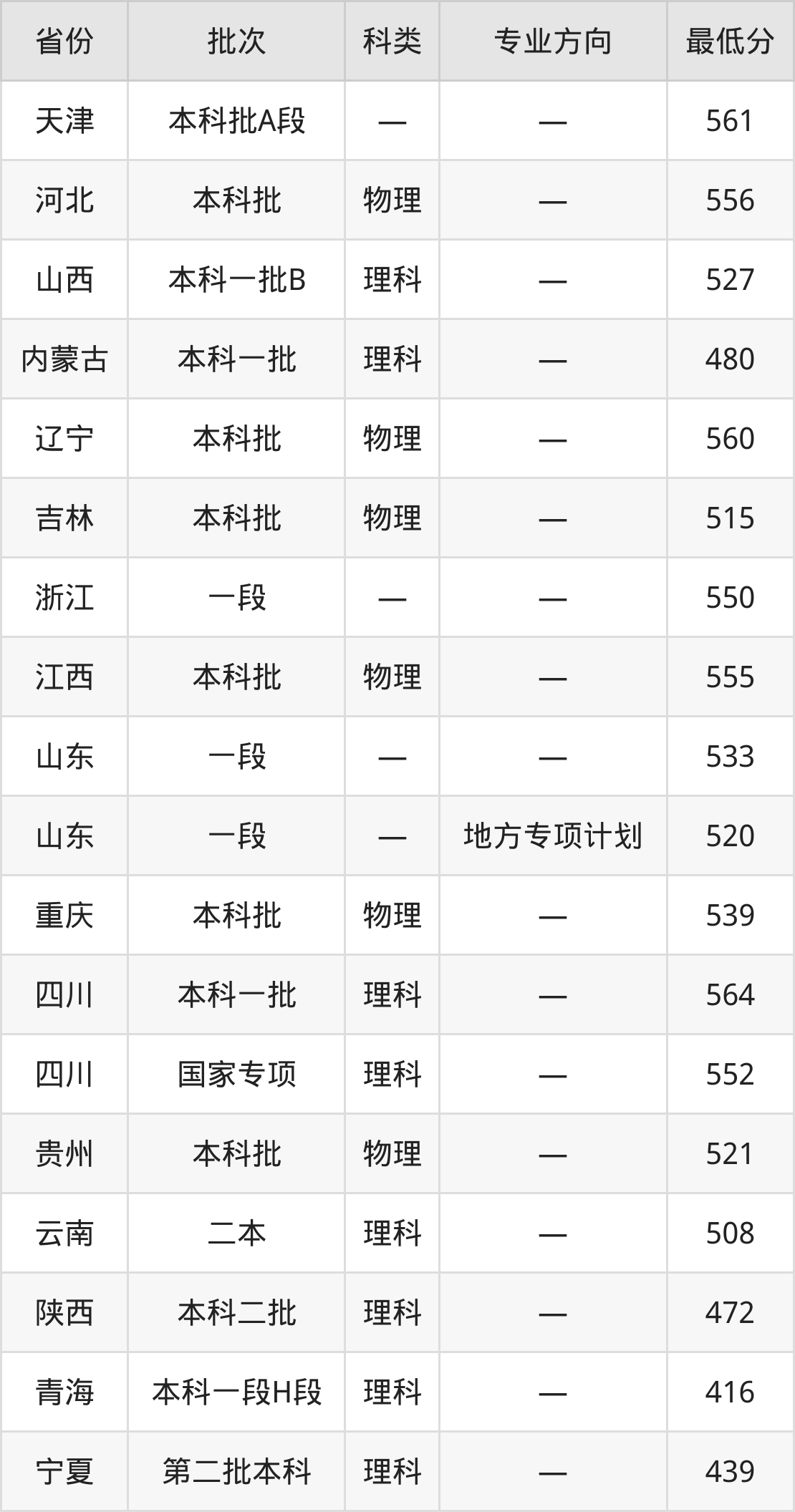 青岛理工大学安全工程专业录取分数线从416分到564分不等,在部分地区的最低分数线如下: