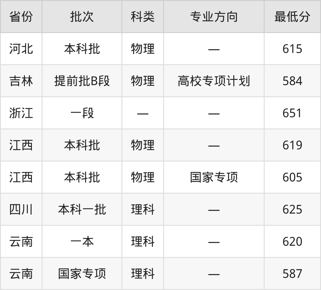 湖南大学土木工程专业在全国各省最低录取分数线为584分(吉林物理类),除此之外,在其余地区的最低分为河北物理类615分、浙江651分、江西物理类605分、四川理科625分等,以上数据均为2024年数据,供2025年高考生参考。