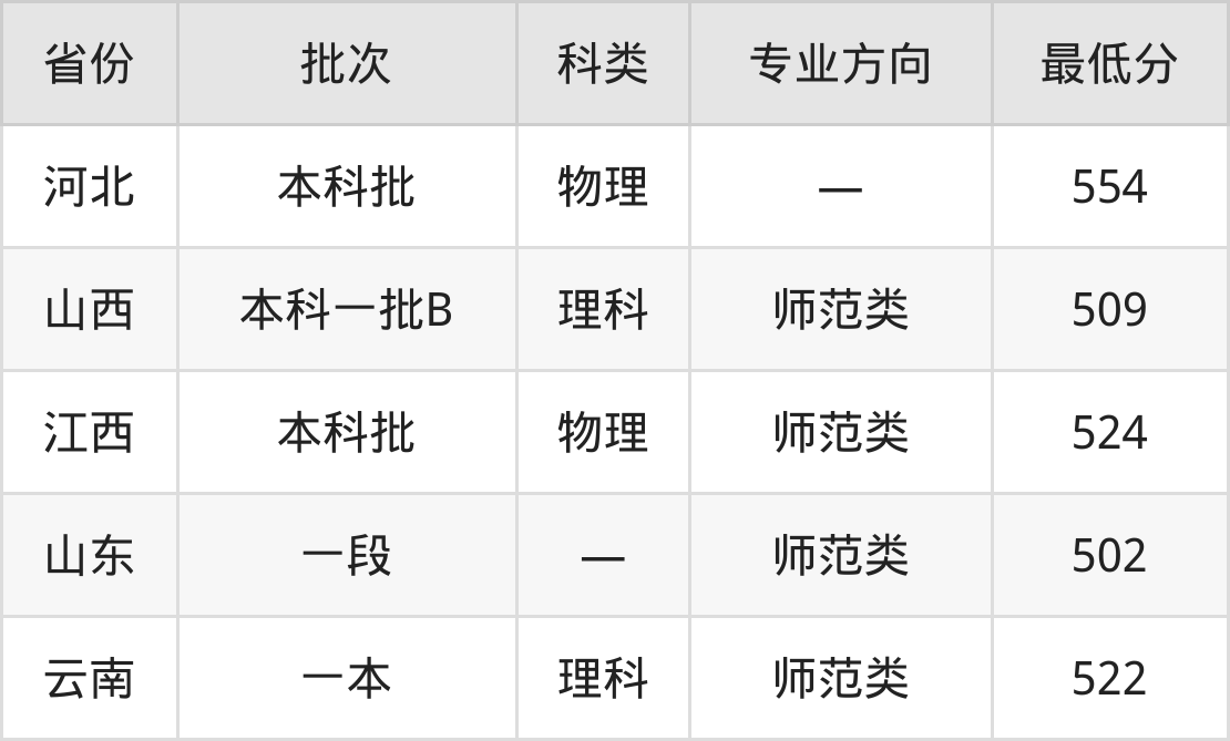 河南师范大学生物科学专业录取分数线从502分到554分不等,最低分数线如下:
