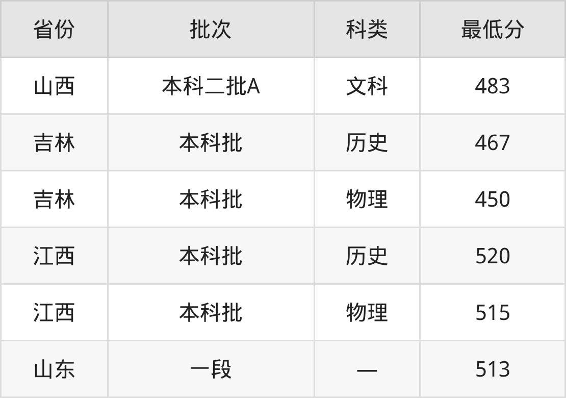 长春工业大学广播电视编导专业在全国各省最低录取分数线为450分(吉林物理类),除此之外,在其余地区的最低分为山西文科483分、江西物理类515分、山东513分,以上数据均为2024年数据,供2025年高考生参考。