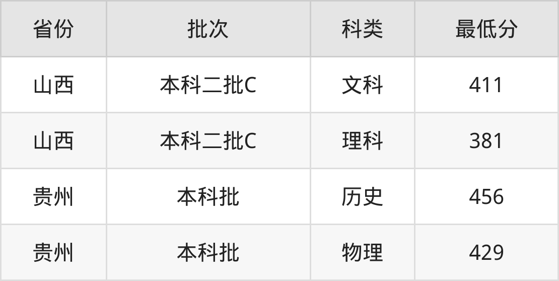 福州工商学院财务管理专业在全国各省最低录取分数线为381分(山西理科),除此之外,在其余地区的最低分为贵州物理类429分,以上数据均为2024年数据,供2025年高考生参考。