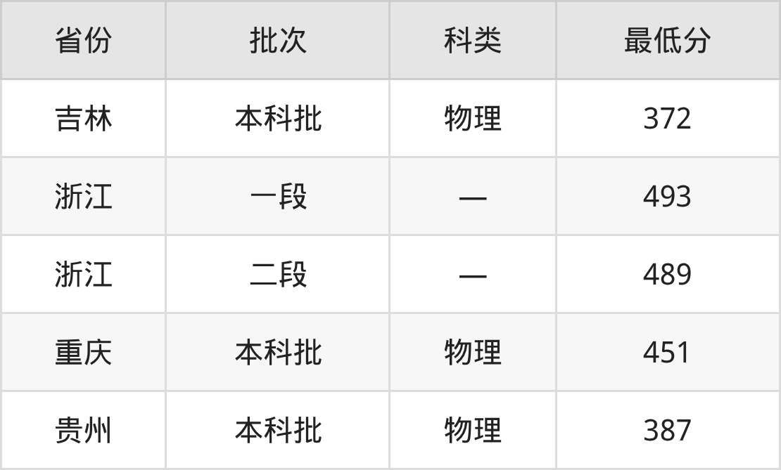 上海建桥学院机械设计制造及其自动化专业在全国各省最低录取分数线为372分(吉林物理类),除此之外,在其余地区的最低分为浙江489分、重庆物理类451分、贵州物理类387分,以上数据均为2025年数据,供2026年高考生参考。