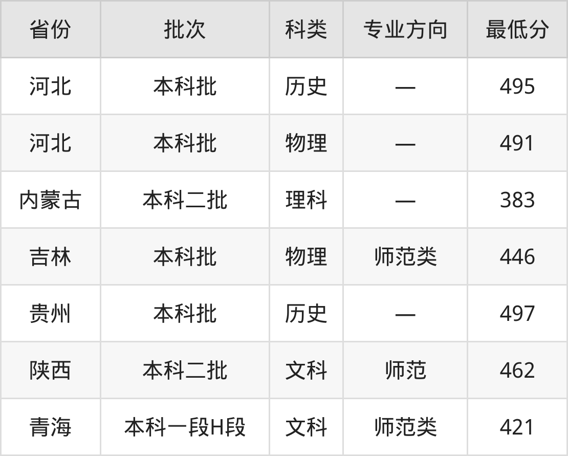 邢台学院学前教育专业在全国各省最低录取分数线为383分(内蒙古理科),除此之外,在其余地区的最低分为河北物理类491分、吉林物理类446分、贵州历史类497分、陕西文科462分等,以上数据均为2024年数据,供2025年高考生参考。