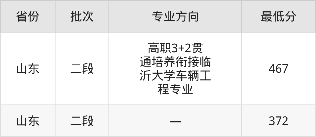 潍坊工程职业学院汽车检测与维修技术专业录取分数线从372分到467分不等,最低分数线如下: