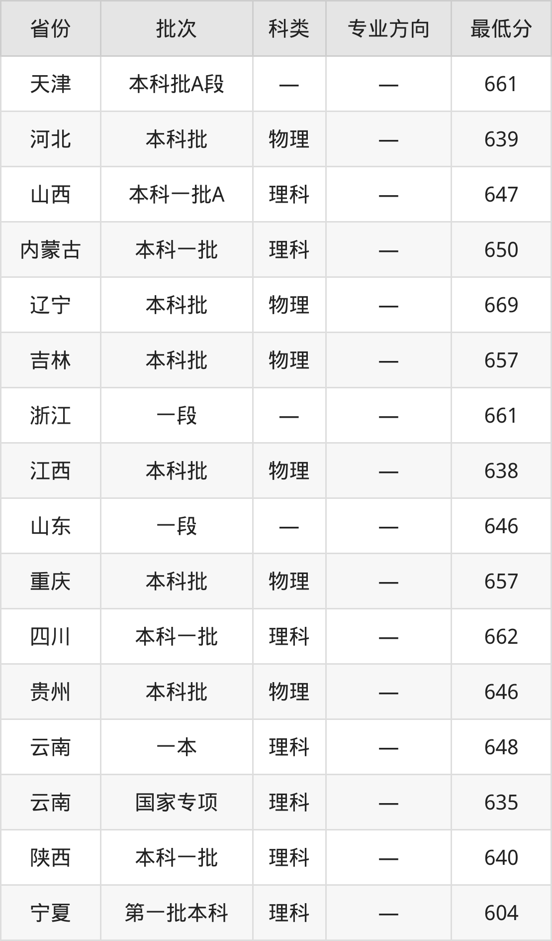 西北工业大学自动化类专业录取分数线从604分到669分不等,在部分地区的最低分数线如下: