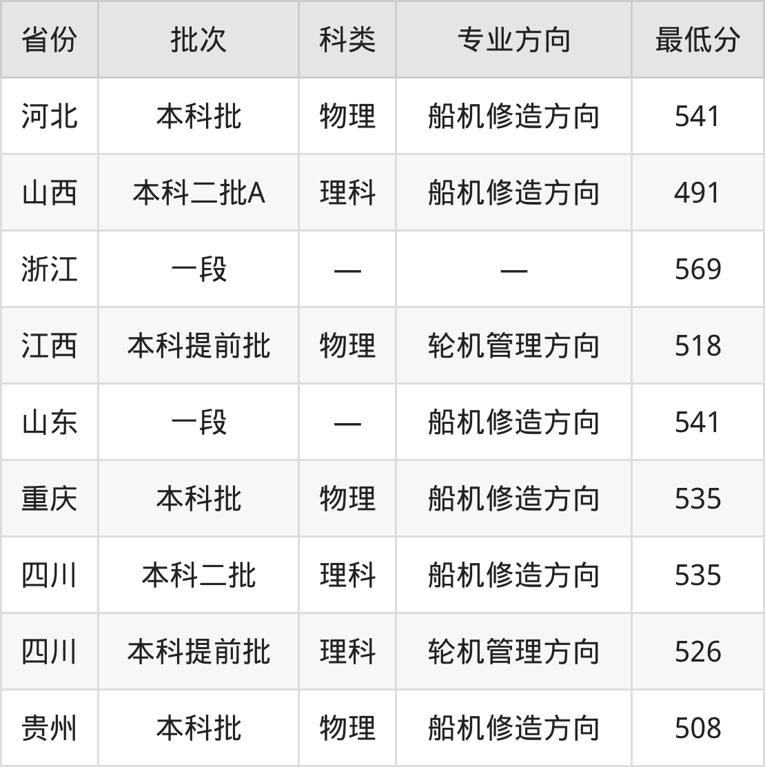 浙江海洋大学轮机工程专业录取分数线从491分到569分不等,最低分数线如下: