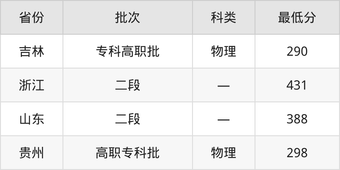 湖北三峡职业技术学院市政工程技术专业在全国各省最低录取分数线为290分(吉林物理类),除此之外,在其余地区的最低分为山东388分、贵州物理类298分、浙江431分,以上数据均为2025年数据,供2026年高考生参考。