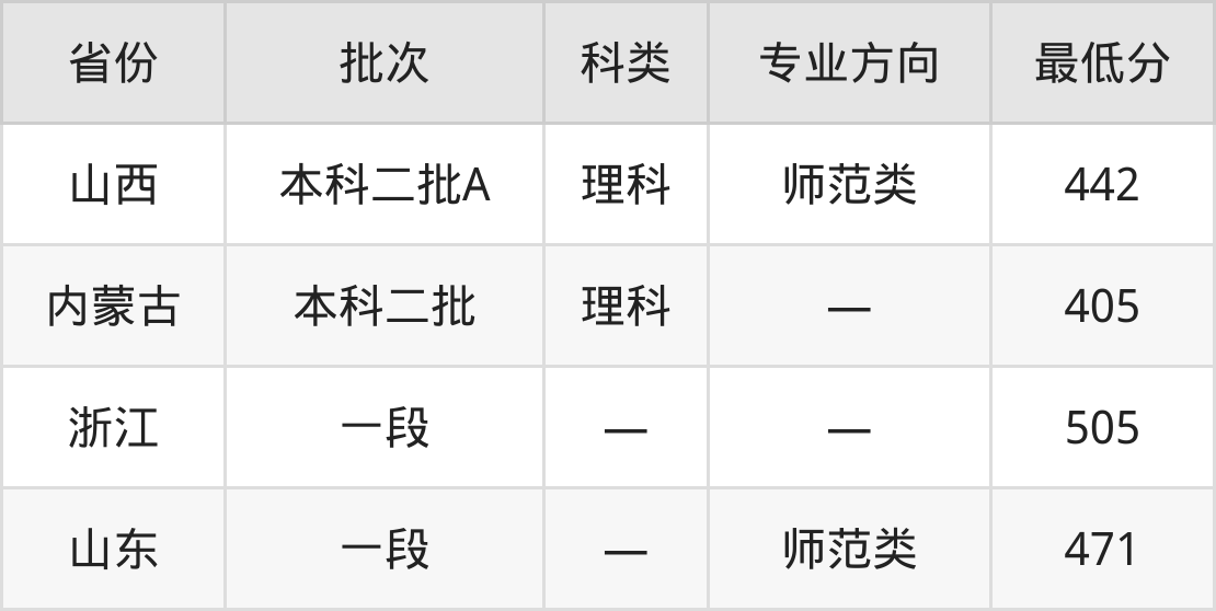 玉林师范学院数学与应用数学专业在全国各省最低录取分数线为405分(内蒙古理科),除此之外,在其余地区的最低分为山西理科442分、浙江505分、山东471分,以上数据均为2024年数据,供2025年高考生参考。