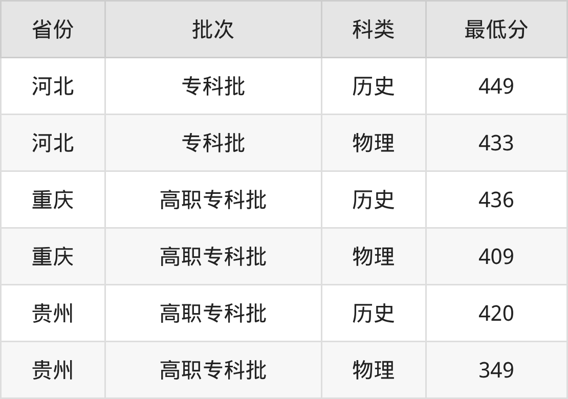 吉安职业技术学院畜牧兽医专业在全国各省最低录取分数线为349分(贵州物理类),除此之外,在其余地区的最低分为重庆物理类409分、河北物理类433分,以上数据均为2025年数据,供2026年高考生参考。