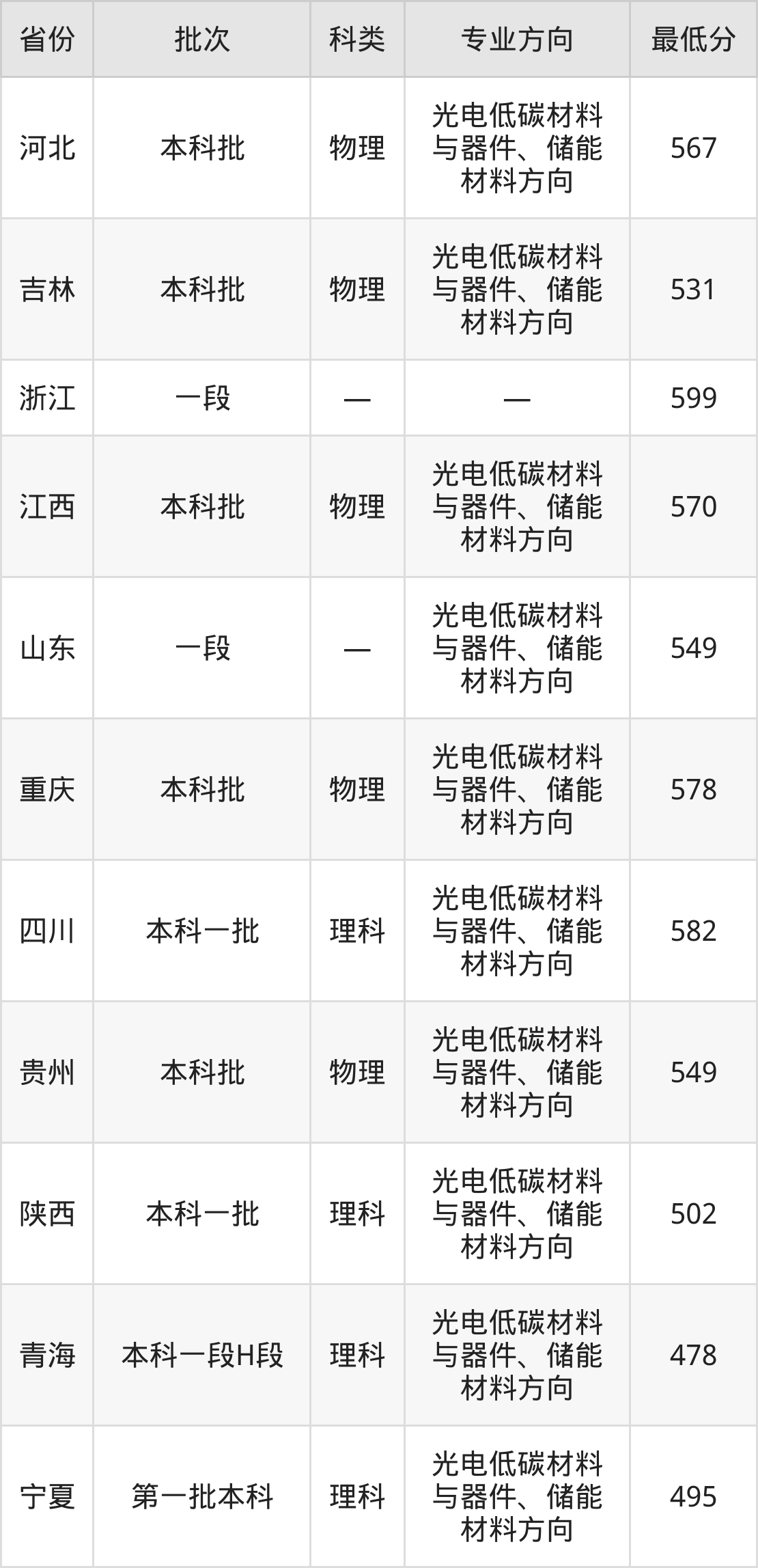 三峡大学新能源材料与器件专业录取分数线从478分到599分不等,在部分地区的最低分数线如下: