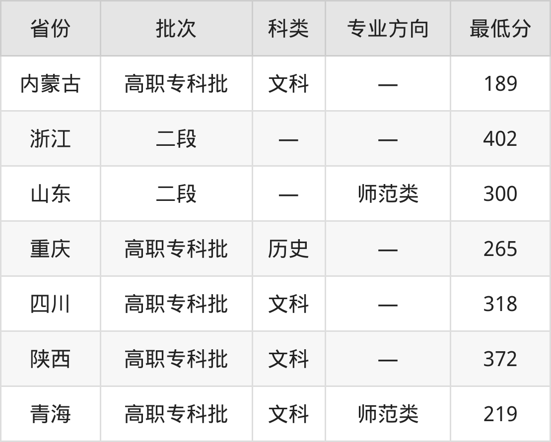 厦门华天涉外职业技术学院学前教育专业在全国各省最低录取分数线为189分(内蒙古文科),除此之外,在其余地区的最低分为浙江402分、山东300分、重庆历史类265分、四川文科318分等,以上数据均为2024年数据,供2025年高考生参考。