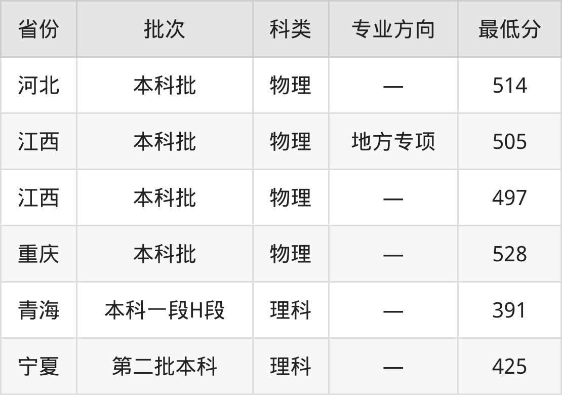赣南医科大学康复治疗学专业在全国各省最低录取分数线为391分(青海理科),除此之外,在其余地区的最低分为江西物理类497分、重庆物理类528分、宁夏理科425分、河北物理类514分,以上数据均为2024年数据,供2025年高考生参考。