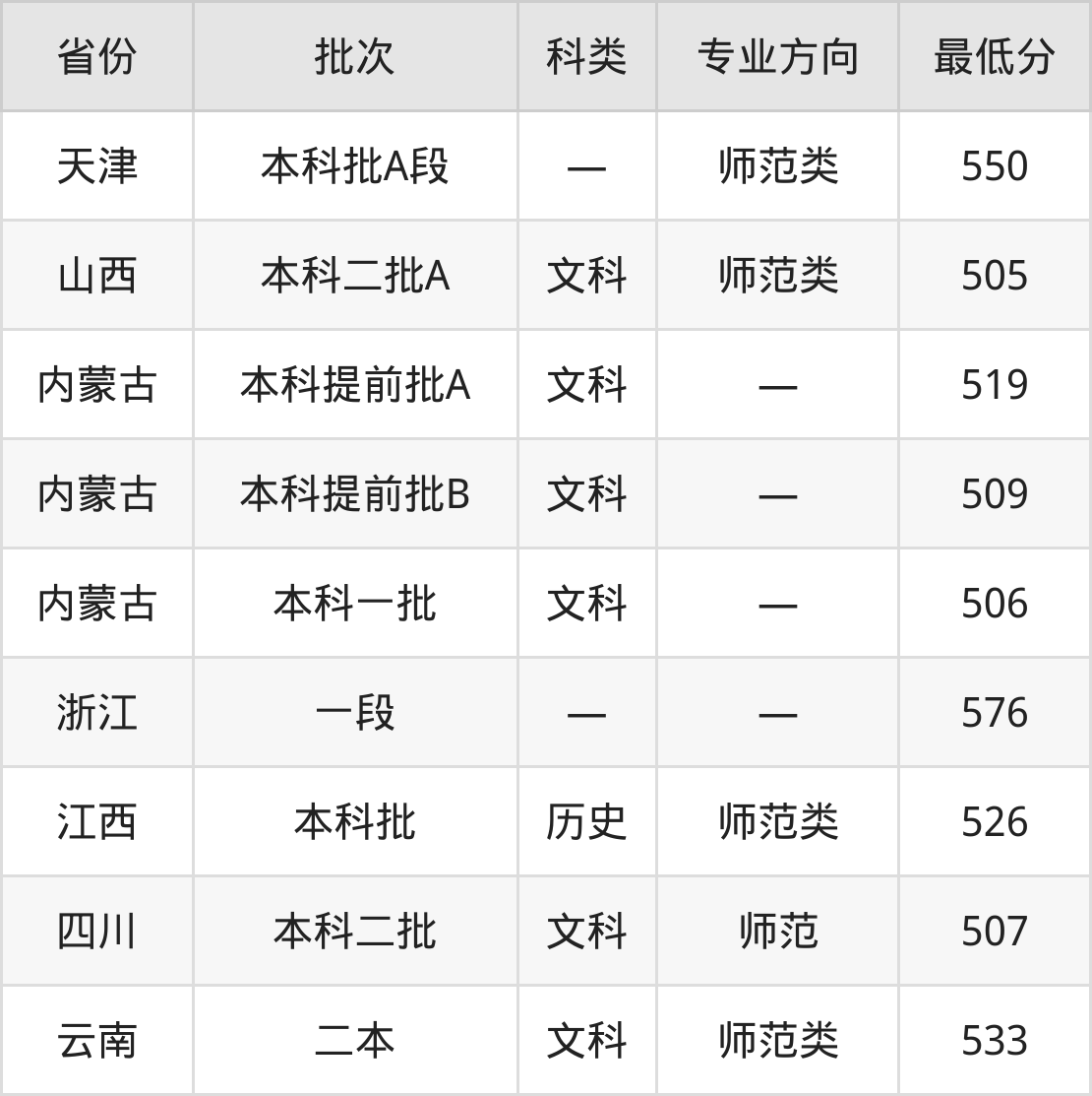 内蒙古民族大学汉语言文学专业在全国各省录取分数线: