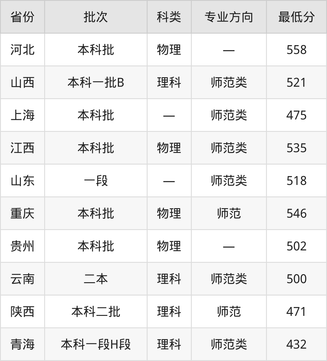 曲阜师范大学生物科学专业录取分数线从432分到558分不等,最低分数线如下: