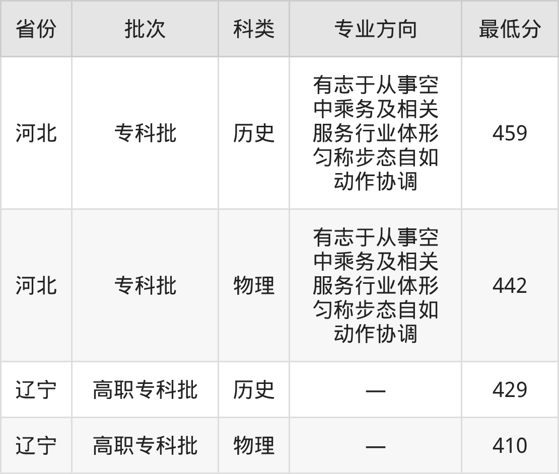 北京经济管理职业学院空中乘务专业录取分数线从410分到459分不等,最低分数线如下:
