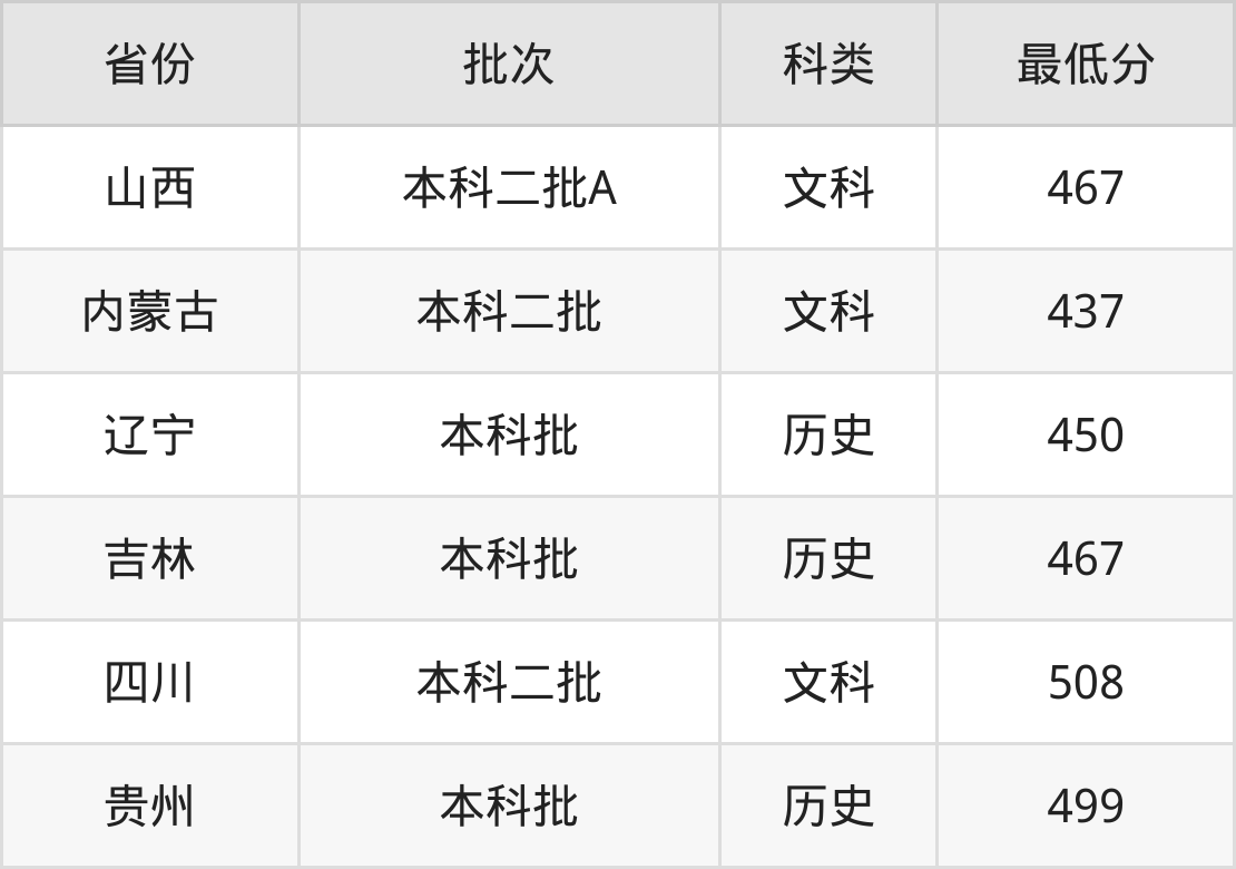 岭南师范学院社会工作专业在全国各省最低录取分数线为437分(内蒙古文科),除此之外,在其余地区的最低分为山西文科467分、辽宁历史类450分、吉林历史类467分、四川文科508分等,以上数据均为2024年数据,供2025年高考生参考。