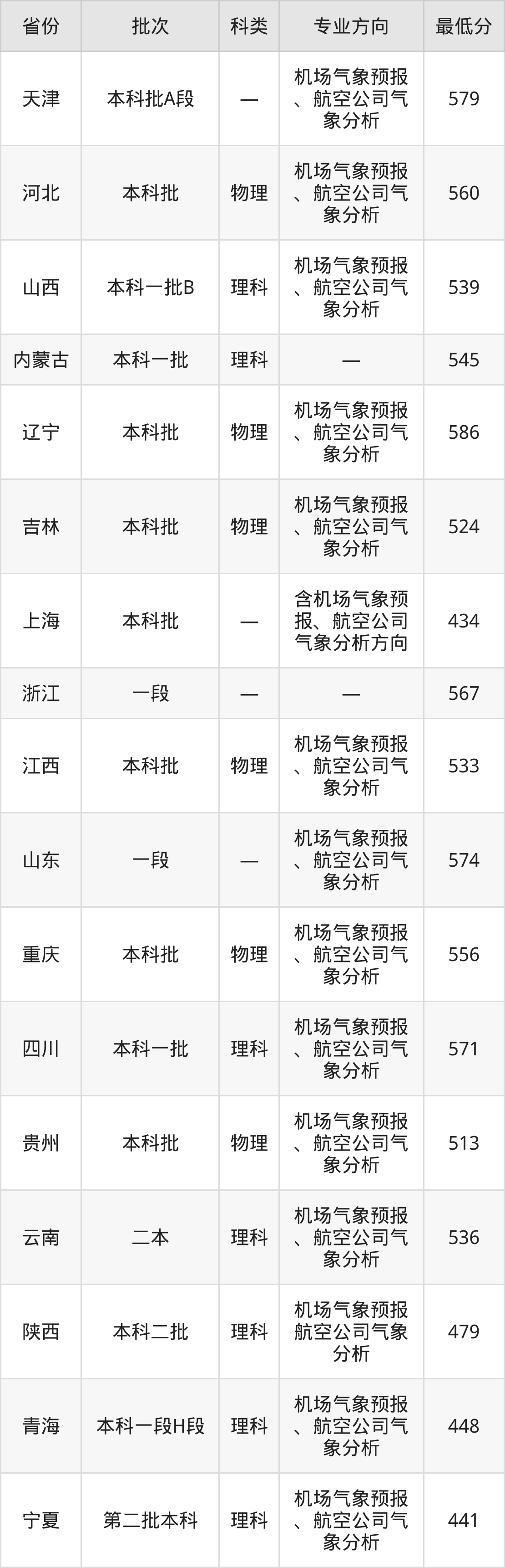 中国民用航空飞行学院应用气象学专业在全国各省录取分数线: