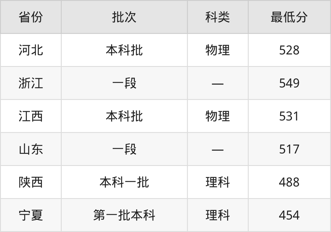 安徽理工大学建筑学专业在全国各省最低录取分数线为454分(宁夏理科),除此之外,在其余地区的最低分为陕西理科488分、河北物理类528分、浙江549分、江西物理类531分等,以上数据均为2024年数据,供2025年高考生参考。