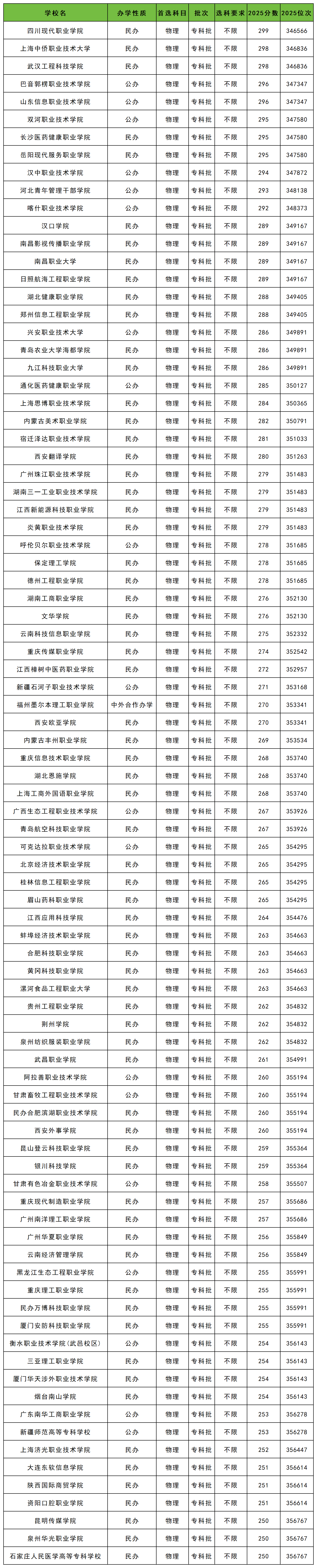 物理类高考250-300分能上的大学全部为专科院校。