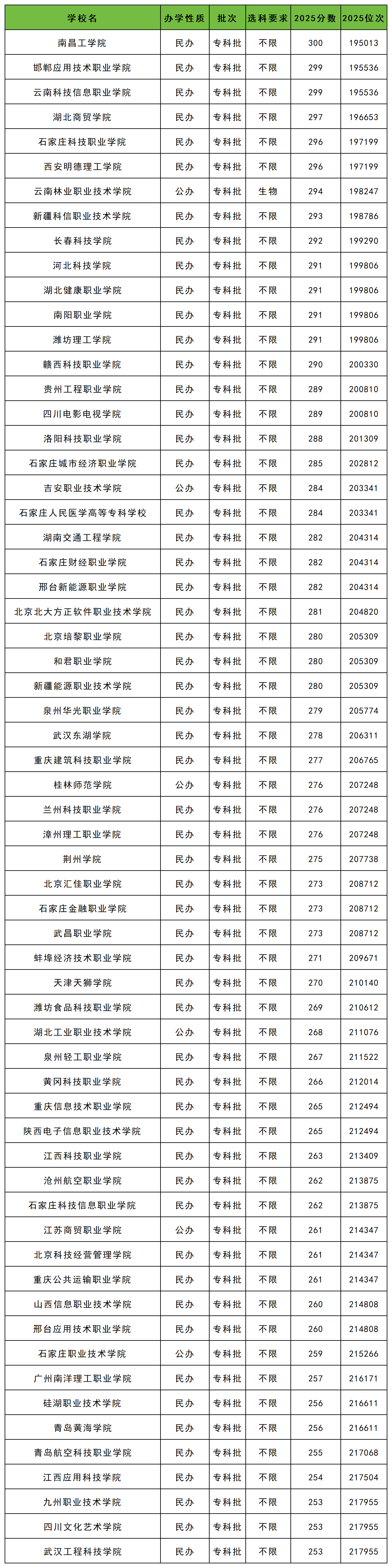 以上推荐的这些学校分数线都不算太高,全部为专科院校招生,非常值得250分到300分的这个分数段的考生报考。