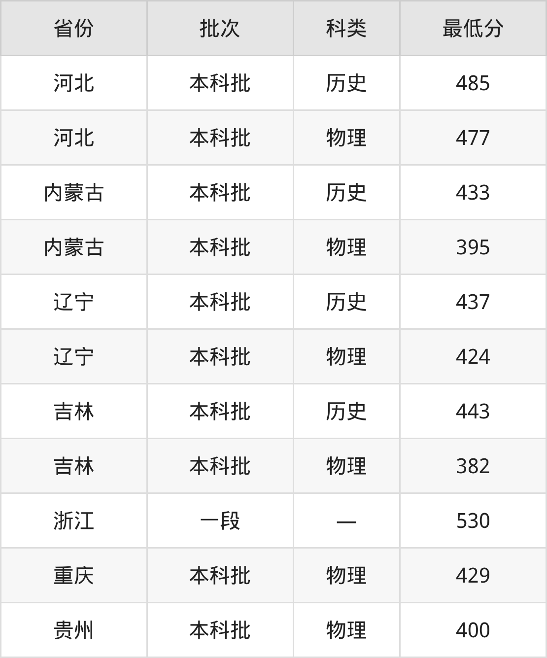 沈阳工学院网络与新媒体专业在全国各省最低录取分数线为382分(吉林物理类),除此之外,在其余地区的最低分为浙江530分、重庆物理类429分、贵州物理类400分、河北物理类477分等,以上数据均为2025年数据,供2026年高考生参考。