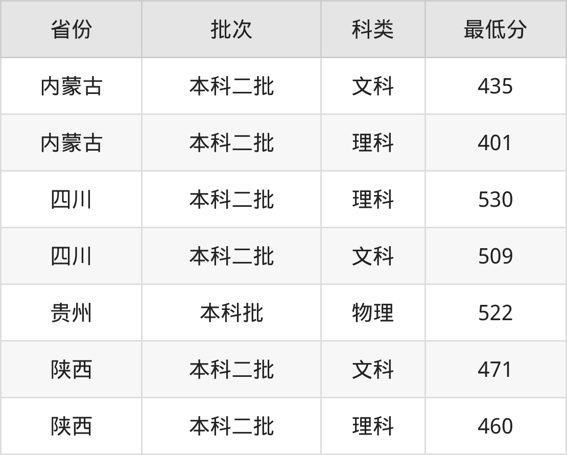 广西科技大学英语专业在全国各省最低录取分数线为401分(内蒙古理科),除此之外,在其余地区的最低分为陕西理科460分、四川文科509分、贵州物理类522分,以上数据均为2024年数据,供2025年高考生参考。