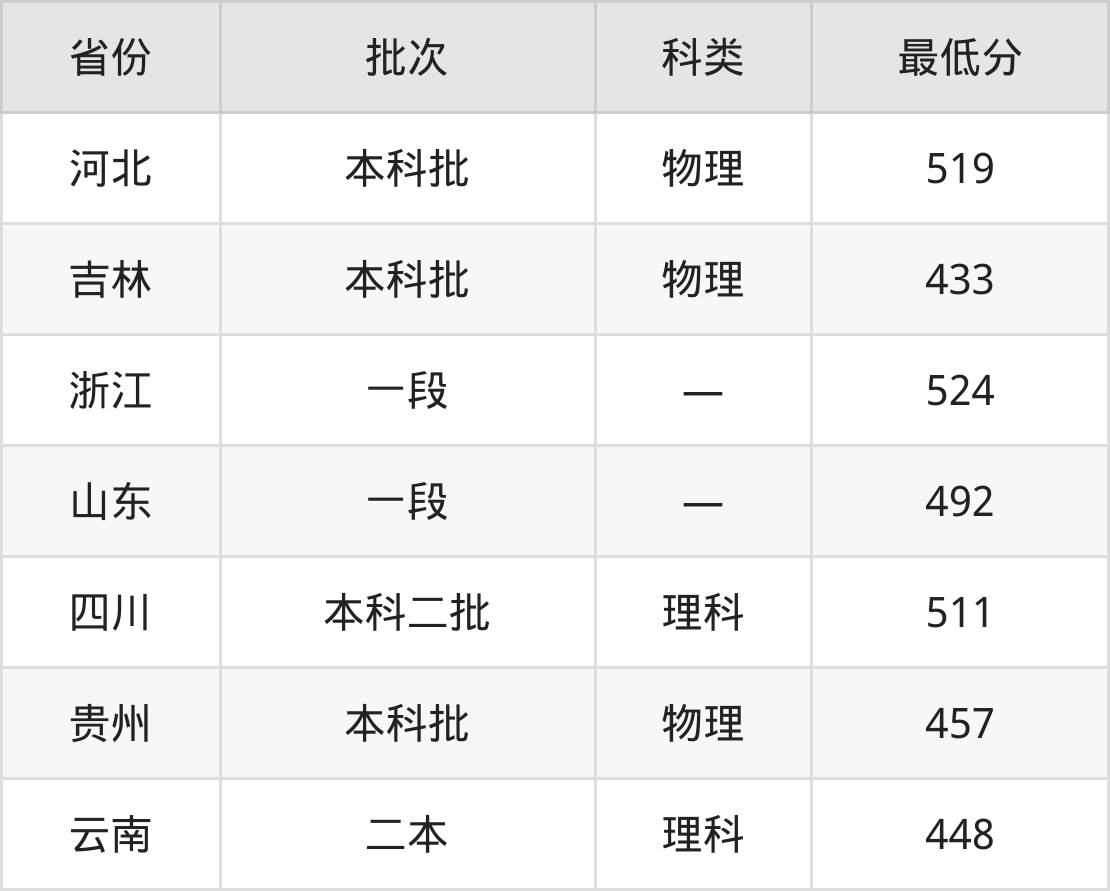 吉林建筑大学消防工程专业在全国各省最低录取分数线为433分(吉林物理类),除此之外,在其余地区的最低分为河北物理类519分、浙江524分、山东492分、四川理科511分等,以上数据均为2024年数据,供2025年高考生参考。