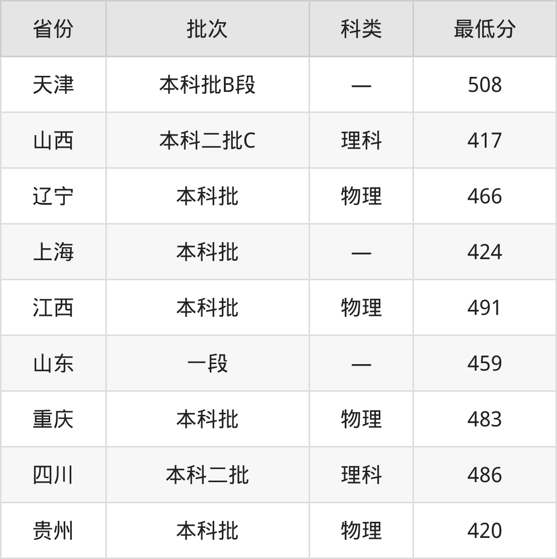 南京工业大学浦江学院计算机科学与技术专业在全国各省最低录取分数线为417分(山西理科),除此之外,在其余地区的最低分为天津508分、辽宁物理类466分、重庆物理类483分、四川理科486分等,以上数据均为2024年数据,供2025年高考生参考。